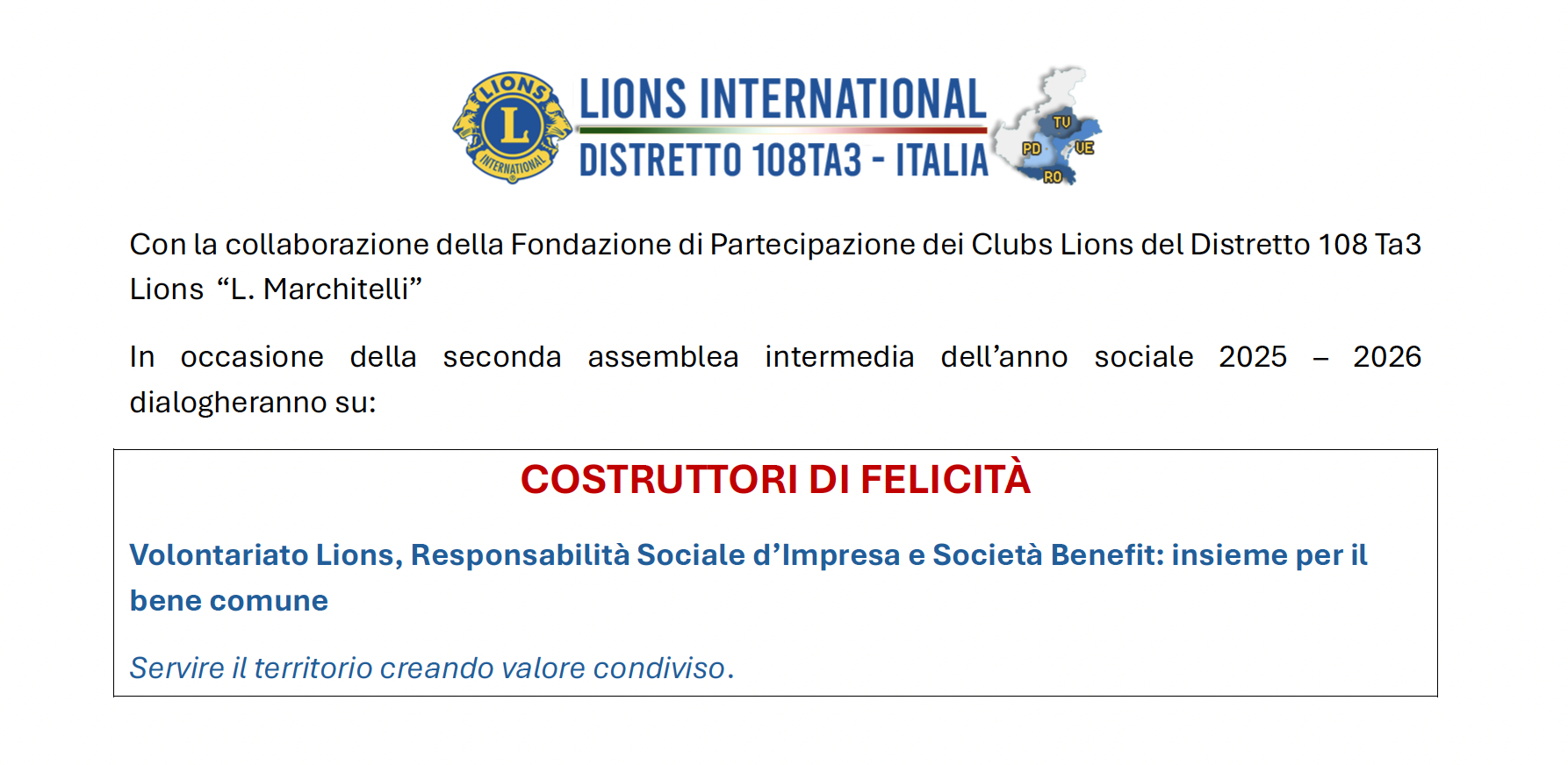 il Distretto 108 Ta3 del Lions Clubs International e la Fondazione di Partecipazione dei Clubs Lions del Distretto 108 Ta3 hanno il piacere di invitarVi alla mattinata di convegno: