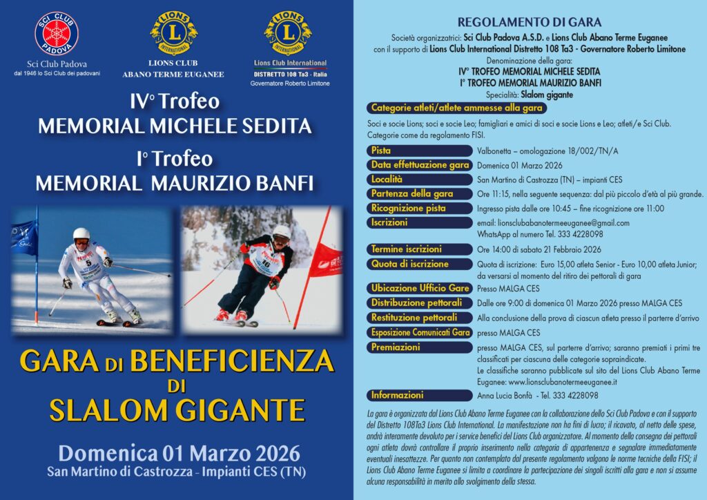 La 4^ edizione del Memorial di sci dedicato a Michele Sedita, indimenticabile socio del Lions Club Abano Terme Euganee che quest’anno diventa anche il 1° Memorial dedicato a Maurizio Banfi, socio del Lions Club Abano Terme Euganee che ci ha lasciato alla fine del 2024, si svolgerà domenica 1 marzo a San Martino di Castrozza (TN), agli Impianti CES.