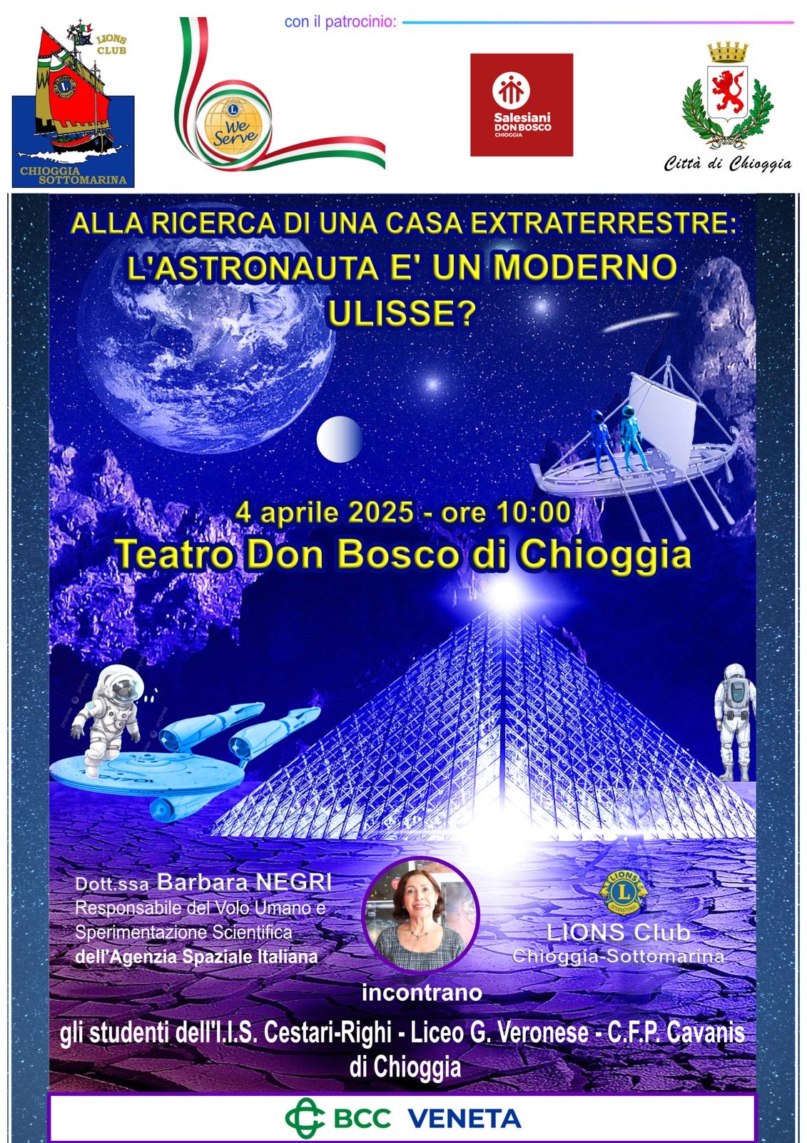 Continua l’impegno del Lions Club Chioggia Sottomarina verso il Sociale. Venerdì 4 aprile al Teatro Don Bosco, la responsabile dell’Unità Volo Umano e Sperimentazione Scientifica dell’Agenzia Spaziale Italiana (ASI), ha incontrato gli studenti del Liceo Veronese, del Cestari e dei Cavanis, per discutere temi legati all’esplorazione spaziale.