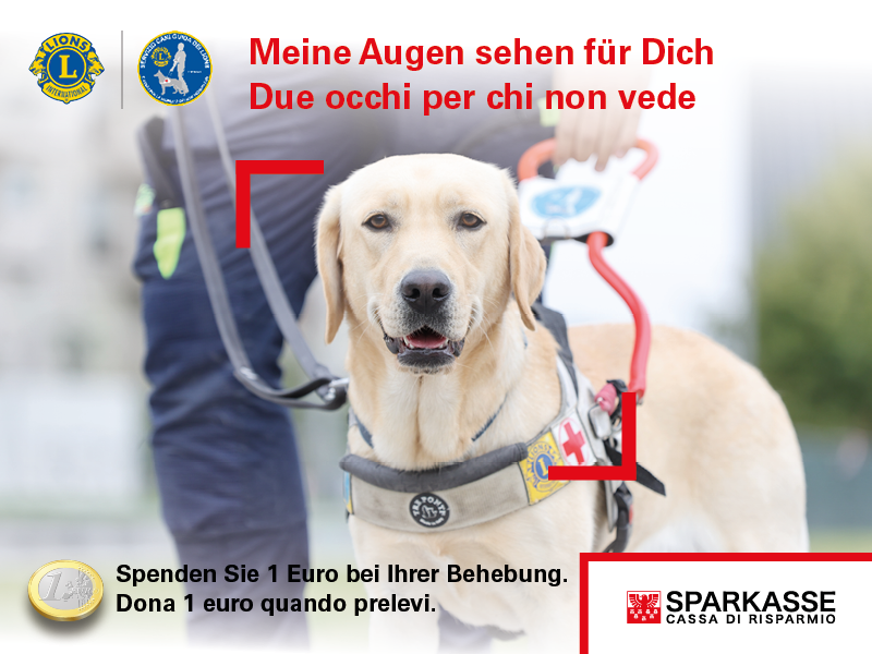 Un service di raccolta fondi per donare un Cane Guida a chi non vede ed allo stesso tempo una poderosa campagna di comunicazione che renderà visibile l’attività del Distretto Lions 108Ta3 a chiunque si recherà agli sportelli automatici del Gruppo Bancario Sparkasse.