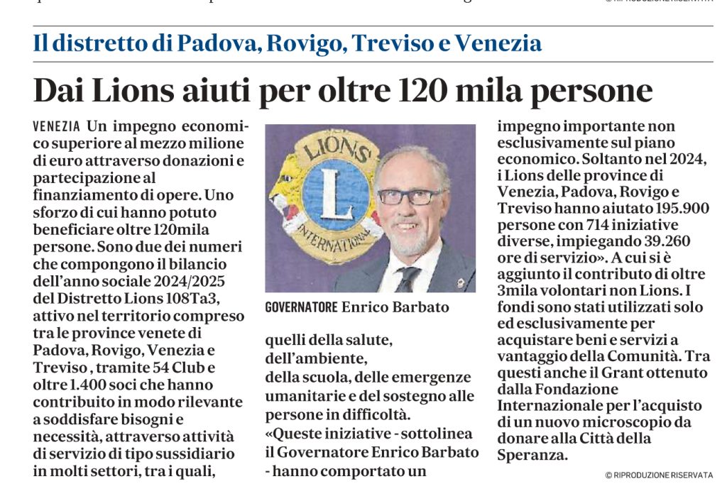 “Queste iniziative – sottolinea il Governatore Enrico Barbato – hanno comportato un impegno economico importante, superiore al mezzo milione di Euro, andato a beneficio di oltre 120 mila persone in modo diretto ovvero tramite le tantissime organizzazioni o Enti del territorio che hanno collaborato alla realizzazione dei Service Lions. Soltanto nel 2024, i Lions delle province di Venezia, Padova, Rovigo e Treviso, e 11 Leo Club (giovani da 12 a 30 anni) hanno aiutato 195.900 persone con 714 iniziative diverse, impiegando 39.260 ore di servizio e investendo oltre 380.000 Euro, fondi utilizzati solo ed esclusivamente per acquistare beni e servizi a vantaggio della Comunità. Tra questi numeri anche il Grant ottenuto dalla Fondazione Internazionale per l’acquisto di un nuovo microscopio da donare alla Città della Speranza. Questi i numeri a livello nazionale 2024: 3,8 milioni di persone aiutate e oltre 8 milioni di Euro investiti”.