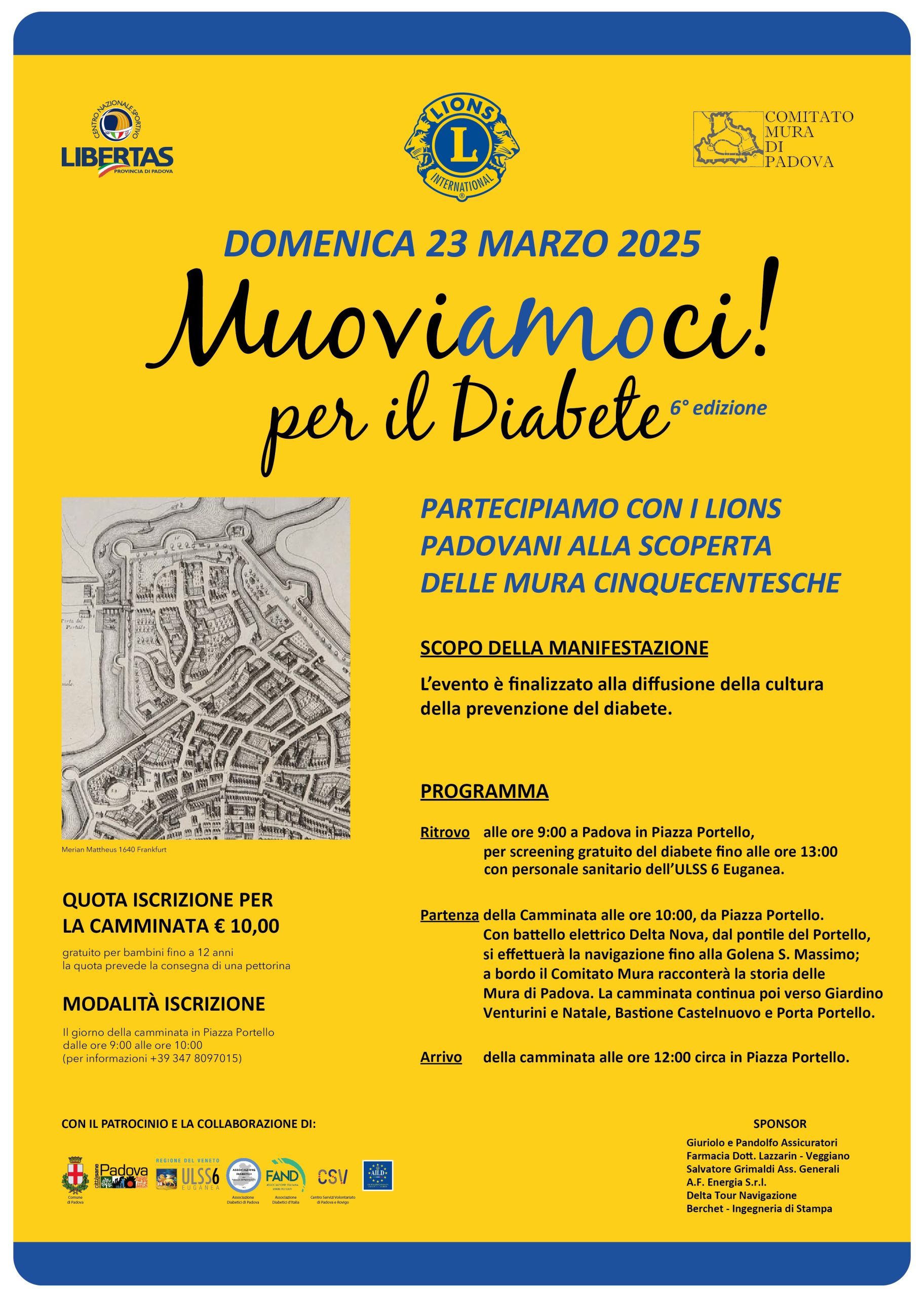 La manifestazione, nata da un’idea dei Lions padovani nel 2018, si è articolata à in due diverse iniziative: dalle ore 9.00 alle ore 13.00, in Piazza Portello, personale sanitario dell’ Az.ULSS 6 EUGANEA ha fornito informazioni sull’importanza dell’attività fisica e della giusta alimentazione, ed effettuato screening diabetologici gratuiti; la “Camminata” è partita invece alle ore 10,00 sempre da Piazza Portello.