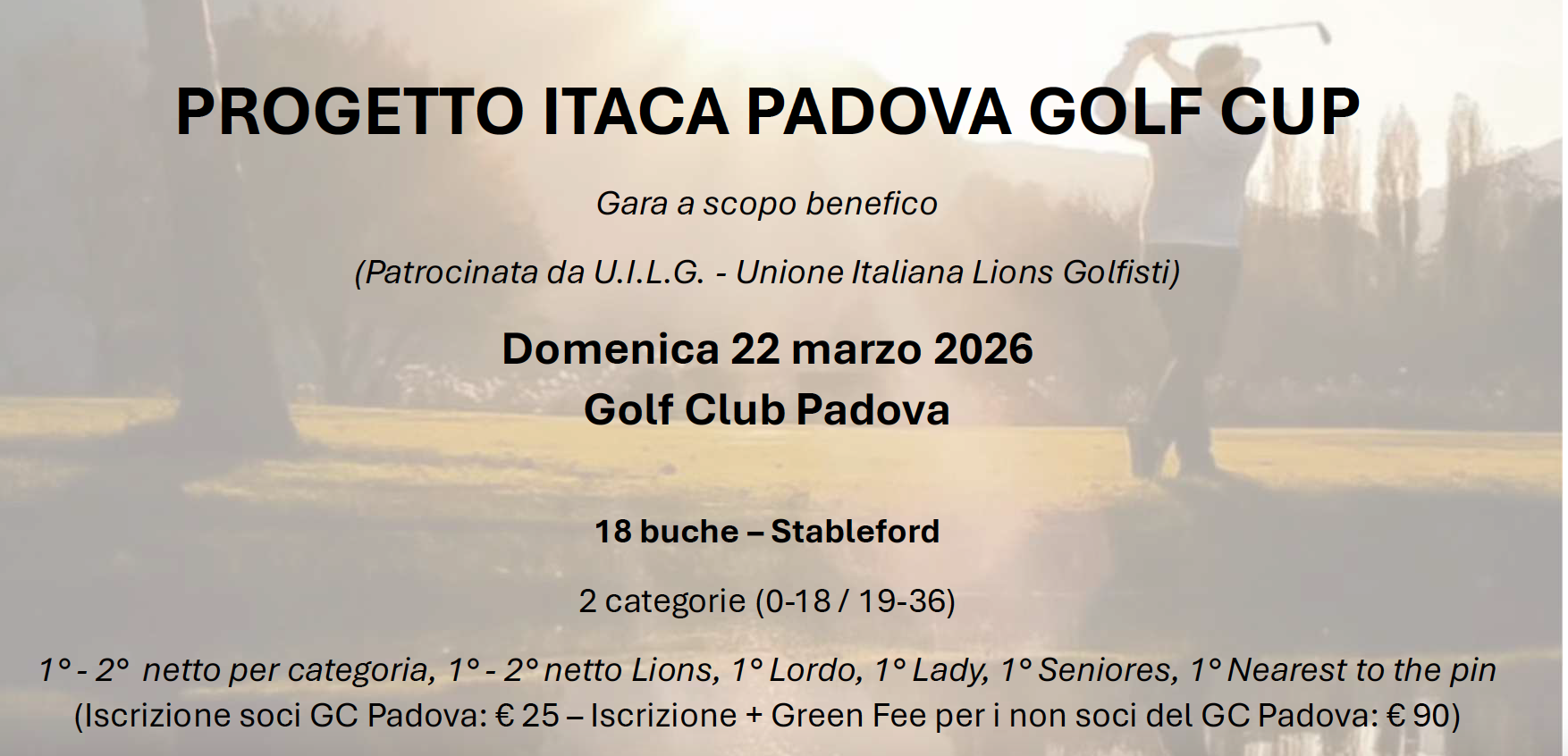 Gara di golf  organizzata in interclub : LC Padova Morgagni , LC Padova Gattamelata, LC Padova Ruzzante Rubianus,  LC Padova Tito Livio, con il patrocinio  dell’U.I.L.G.- Unione Italiana Lions Golfisti, il cui ricavato sarà devoluto a Progetto Itaca Padova ODV  (via dei Tadi – Padova)un centro diurno per lo sviluppo dell’autonomia socio-lavorativa di persone con disturbi psichici.