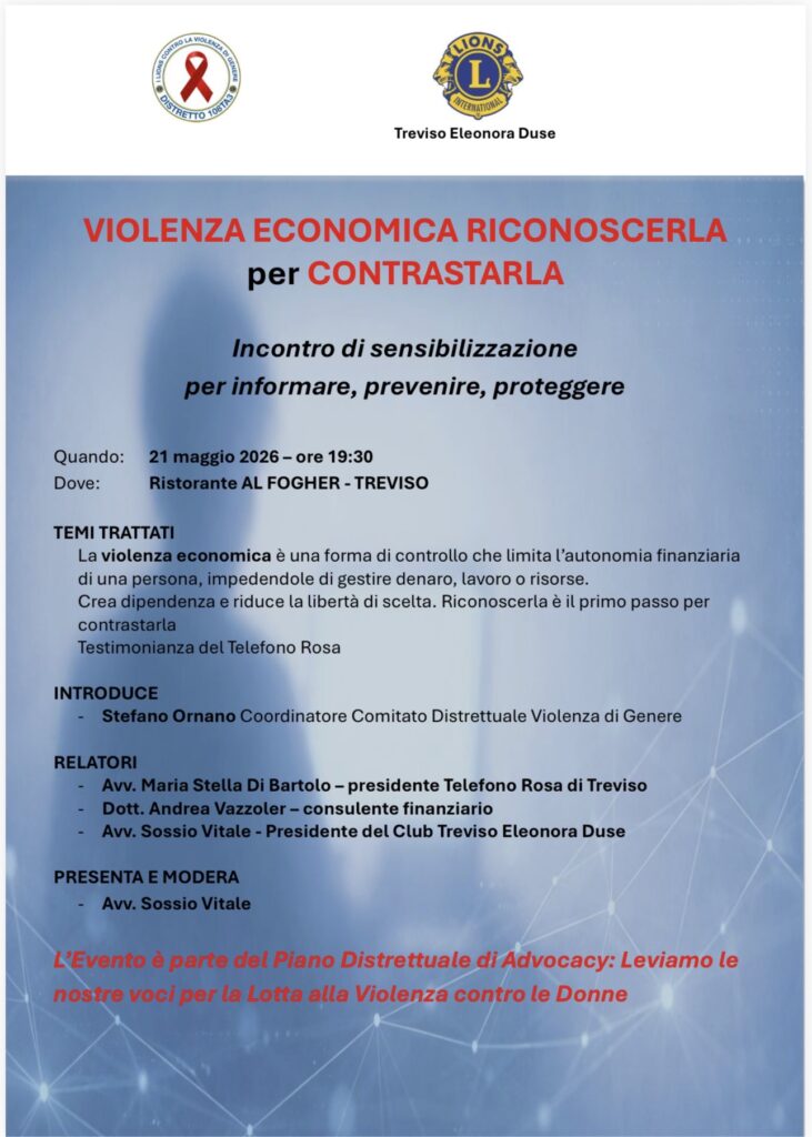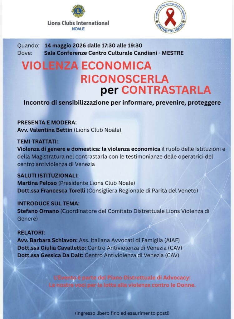 Uno dei due eventi si terrà a Mestre, il 14 maggio, promosso da Valentina Bettin, durante il quale relazioneranno legali ed altre personalità competenti sulla materia alla presenza del Presidente del Consiglio Comunale di Venezia ed un secondo a Treviso il 21 maggio, organizzato da Sossio Vitale, con la partecipazione del Telefono Rosa di Treviso e con la collaborazione di soci Lions esperti nella materia.
