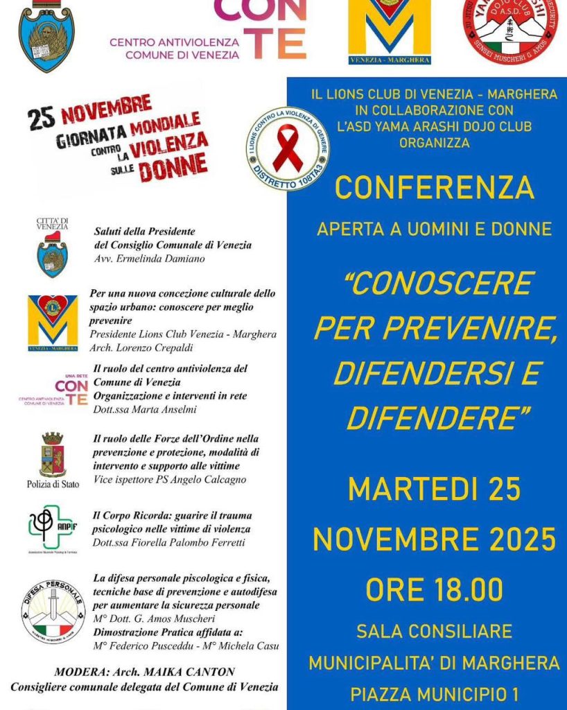 Il Club Venezia Marghera ha organizzato il 25 novembre una conferenza presso la Sala Consiliare della Municipalità di Marghera sul tema “Conoscere per Prevenire, Difendersi e Difendere” con interventi del Centro Antiviolenza, della Polizia di Stato, di una Psicologa e dei Responsabili di “Difesa Personale”, un centro di addestramento per l’autodifesa